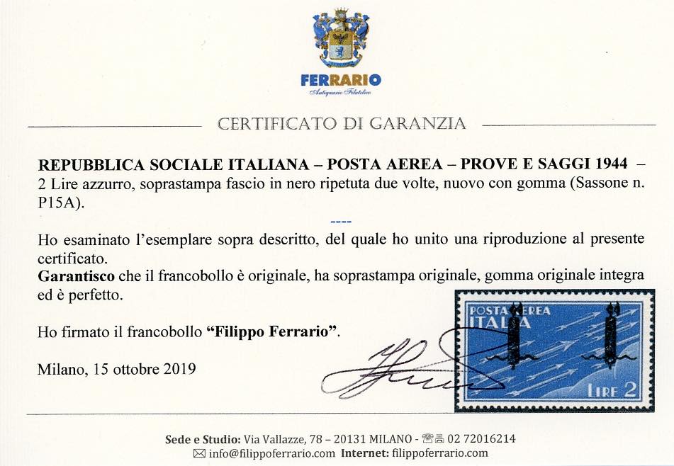 POSTA AEREA 1944 - 2 lire azzurro, soprastampa fascio in nero ripetuta due volte (P15A), gomma integra, perfetto. Bello e raro! Cert. ... Leggi tutto