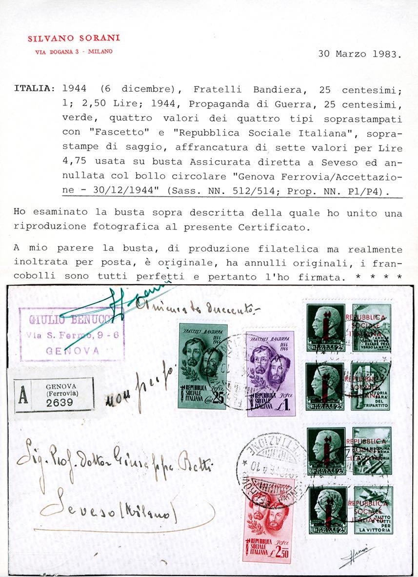 PROPAGANDA DI GUERRA 1944 - 25 cent. soprastampati "fascetto" e "Repubblica Sociale Italiana", serie completa, Fratelli Bandiera, serie completa (P1/P4,512/514), perfetti, su busta assicurata da Genova 30/12/1944 a Seveso, bolli di transito e di arrivo al verso. Rarissima. Cert. Sorani.