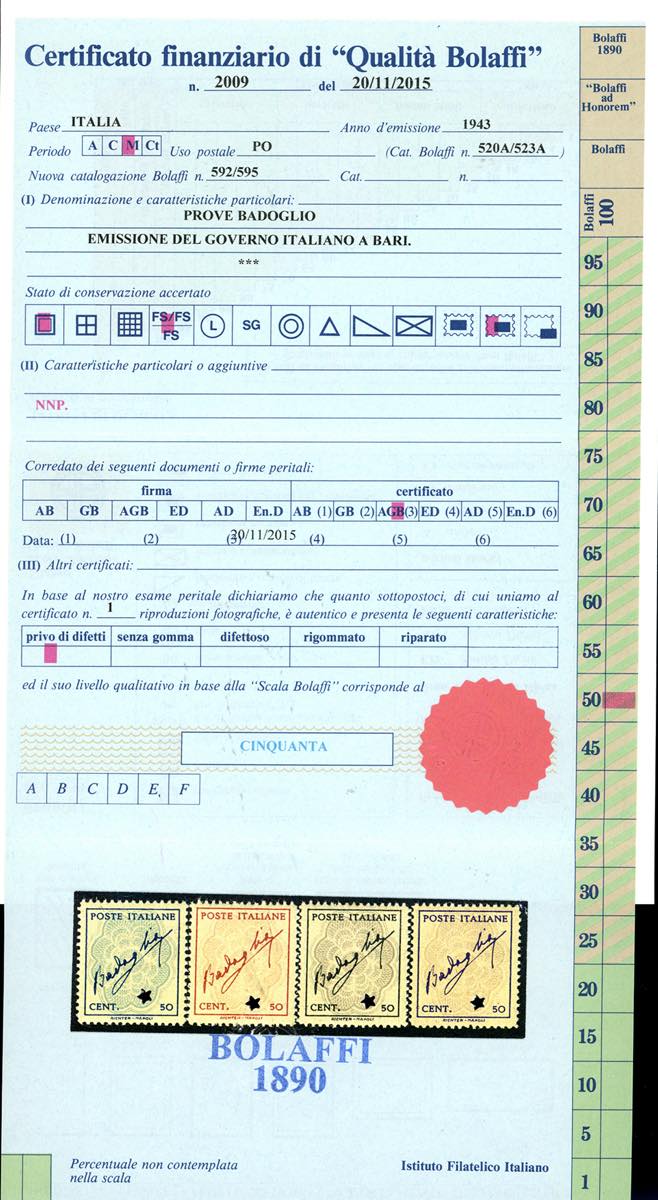 1944 - Badoglio, senza filigrana, serie completa (515F/515I), nuovi, gomma originale integra, perfetti. Molto belli e rari. Raybaudi, cert. Finanziario Bolaffi.