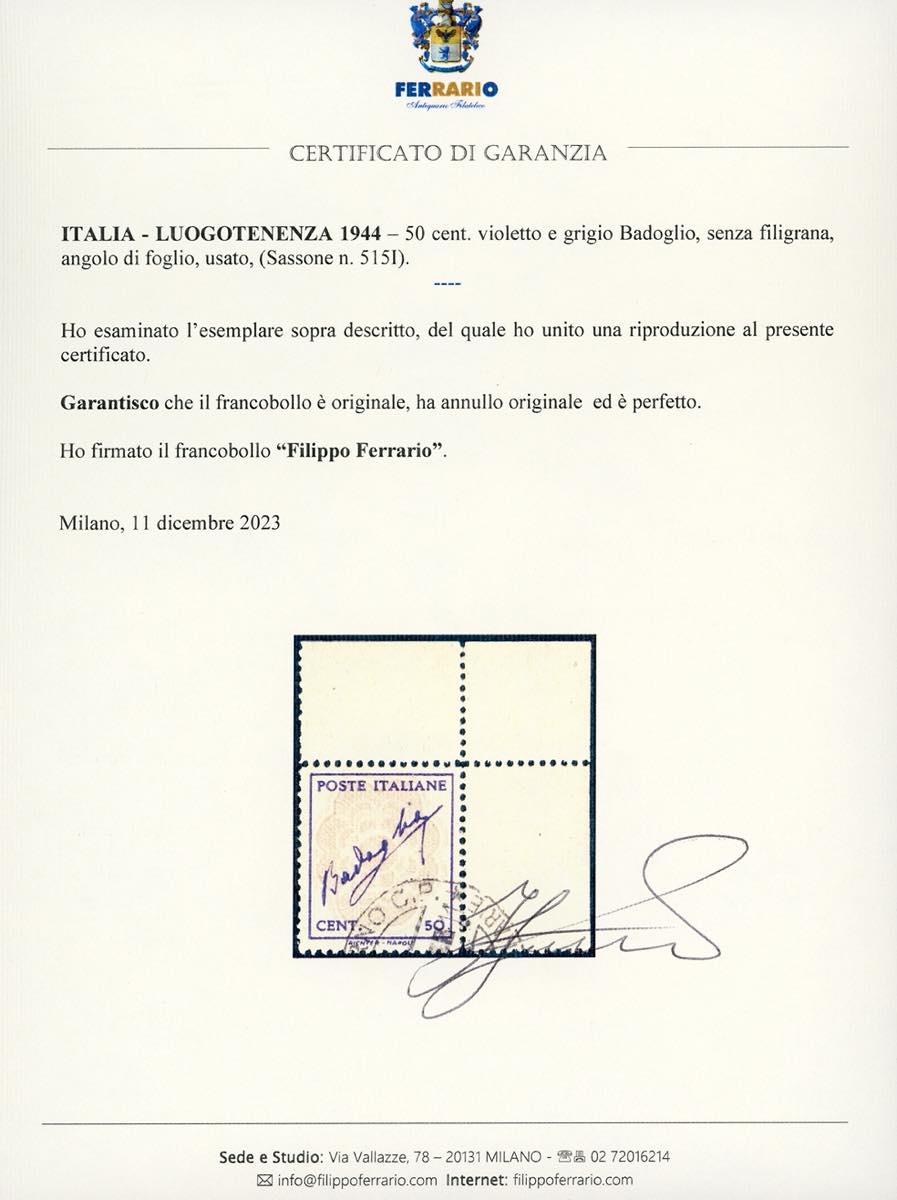 1944 - 50 cent. violetto e grigio Badoglio, senza filigrana (515I), angolo di foglio, usato, perfetto. A.Diena, cert. Ferrario.