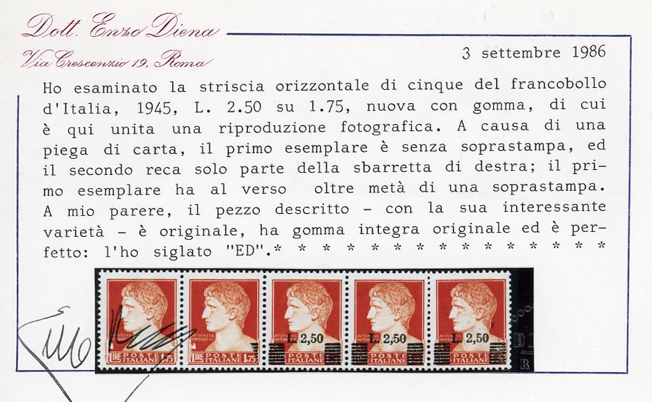 1945 - 2,50 lire su 1,75 lire Imperiale, striscia orizzontale di cinque, il primo esemplare senza soprastampa al recto e solo parziale al verso, il secondo con parte delle sbarette di destra, gli altri normali (523ab), nuova, gomma originale integra, perfetta. Insieme splendido e raro! Ferrario, cert. Diena.