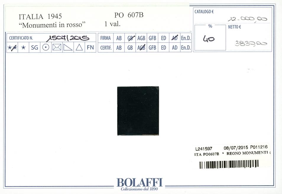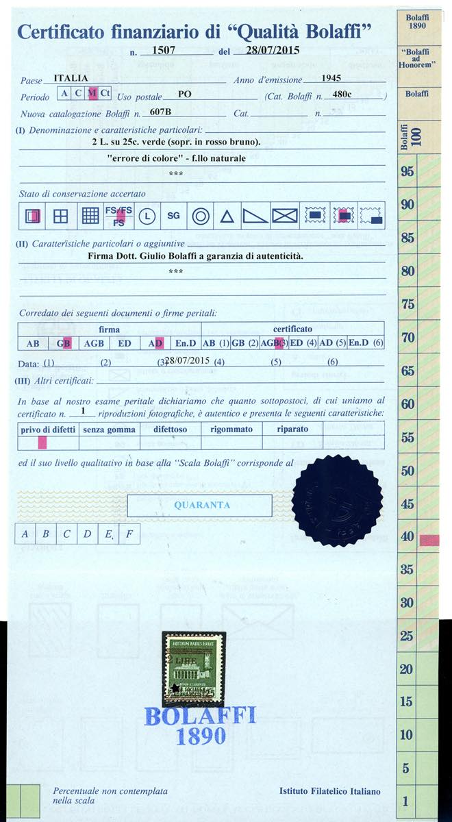 1945 - 2 lire su 25 cent. Monumenti Distrutti, soprastampa rosso bruno (525A), nuovo, gomma originale integra, perfetto. Molto fresco e raro. G.Bolaffi, Colla, A.Diena, cert. Finanziario Bolaffi.