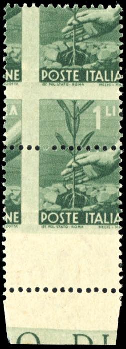 1945 - 1 lira Democratica, dentellatura fortemente spostata nei due sensi (550va), coppia verticale, l'esemplare inferiore senza l'indicazione del valore, bordo di foglio, gomma originale integra, perfetta. Cert. E.Diena.