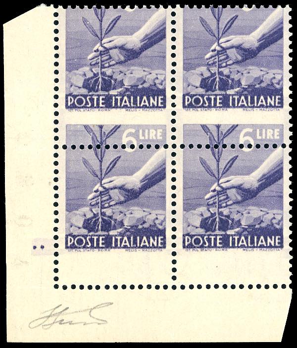 1947 - 6 lire Democratica, dentellatura orizzontale fortemente spostata in basso (556u), blocco di quattro, angolo di foglio, i due valori inferiori senza la scritta del valore "6 lire", gomma originale integra, lievemente bicolore, perfetto. Bella e rara la seconda varietà. Ferrario.