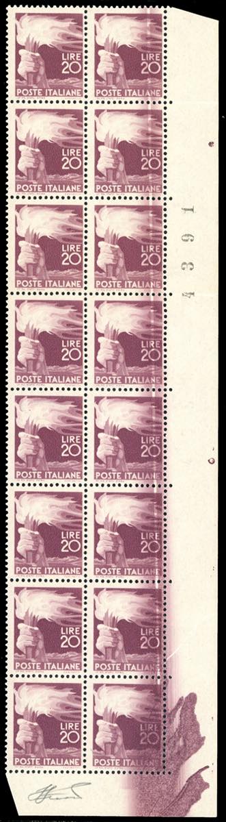 1945 - 20 lire Democratica (561), blocco di 16, gli otto esemplari di destra interessanti da un vistoso taglio chirurgico, che termina in un'evidente macchia di colore che interessa l'ultimo esemplare e il relativo angolo di foglio, gomma originale integra, perfetto. Ferrario.
