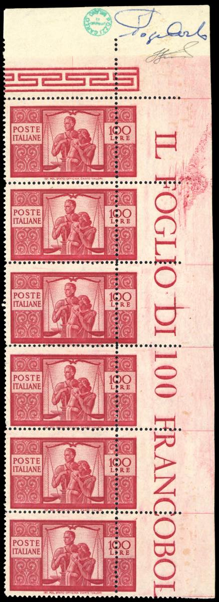1946 - 100 lire Democratica, II lastra, dent. 14 1/4 (Sass.spec.25), striscia verticale di sei, dentellatura verticale destra fortemente spostata a sinistra, angolo di foglio, pos. 50 con triangolino evanescente e pos. 60 con riga di colore nell'angolo superiore destro, gomma originale integra, perfetta. Molto rara e di ottima qualità. Cert. Ferrario.