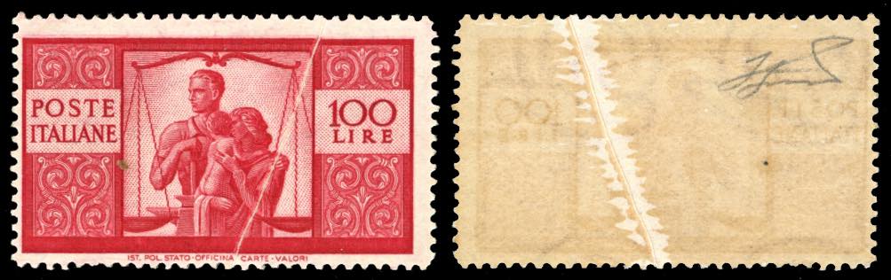 1946 - 100 lire Democratica, II lastra, dent. 14 1/4 x 14 1/4, carta grigia (Sass.spec.25), evidente pli d'accordeon diagonale, gomma ... Leggi tutto