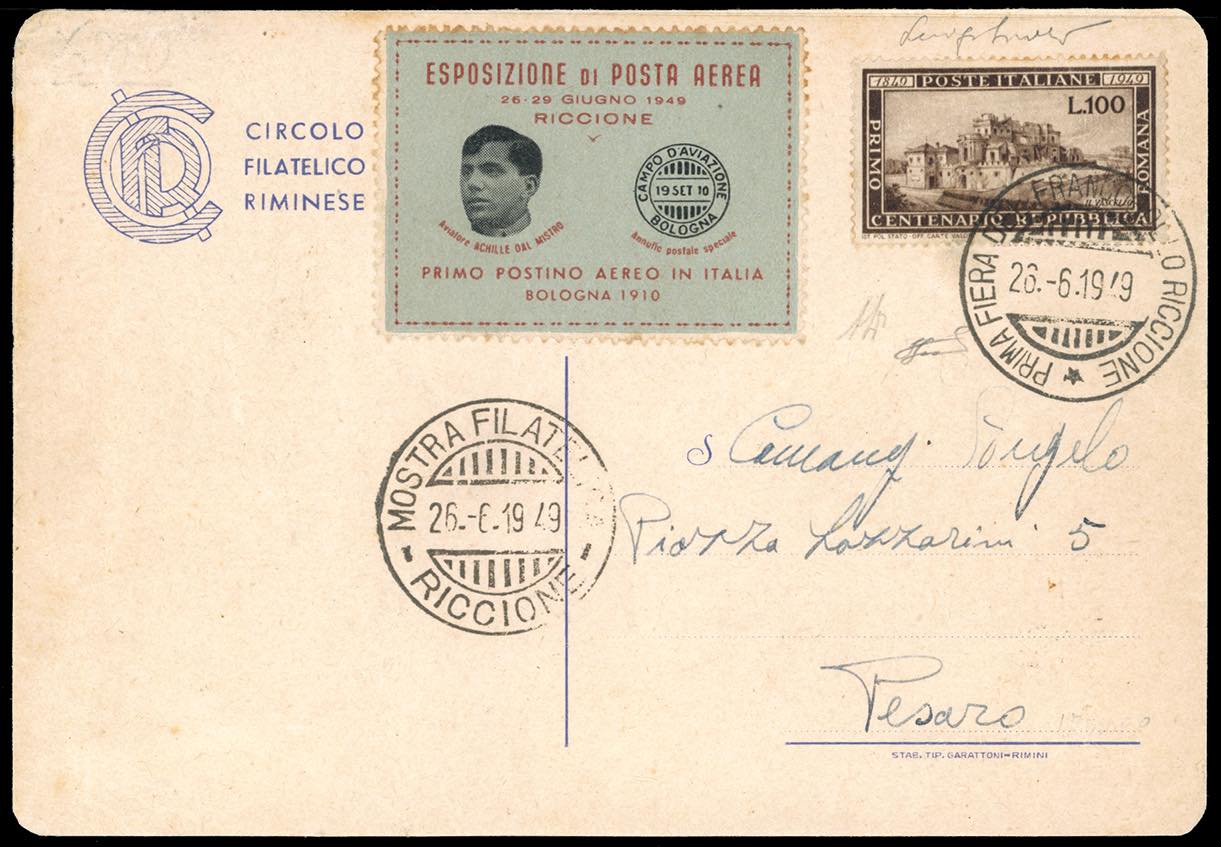 1949 - 100 lire Romana (600), perfetto, su cartolina della "Prima Fiera del Francobollo Riccione" 26/6/1949 a Pesaro, con vignetta erinnofila dell'esposizione di posta aerea. Non comune. A.Diena, Ferrario, cert. Sirotti.
