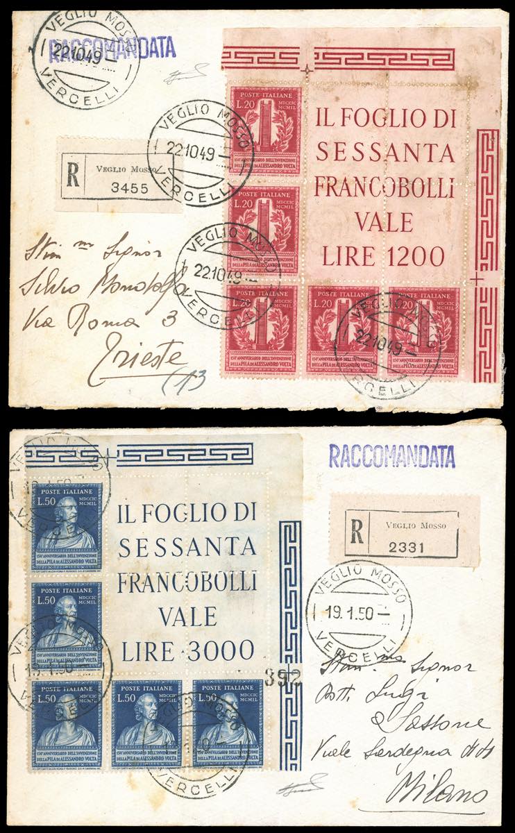 1949/50 - Volta, serie completa (611/612), blocchi angolari di 5, perfetti, ciascuno su busta raccomandata da Veglio Mosso, il 20 lire in data 22/10/1949 per Trieste, il 50 lire in data 19/1/1950 per Milano, entrambe con bollo d'arrivo. Insieme estremamente raro, probabilmente unico. Cert. Ferrario.