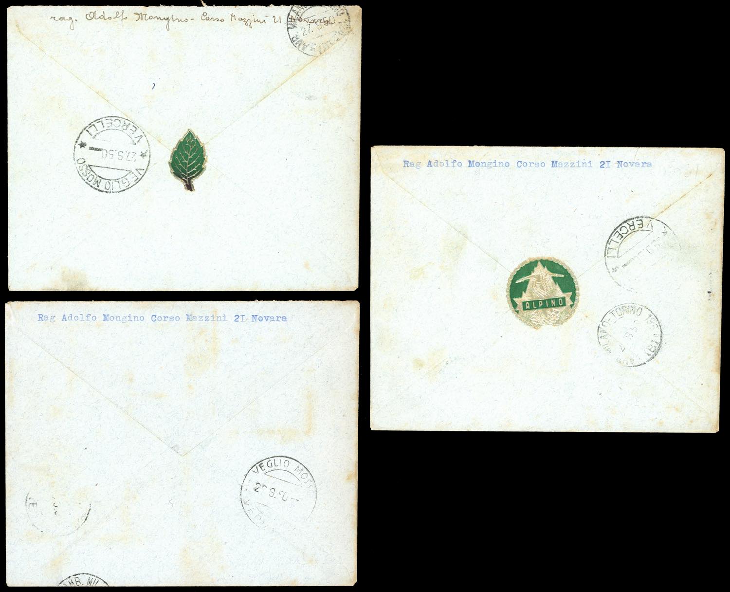 1950 - Tabacco, serie completa (629/631), blocchi angolari di 5, perfetti, i due bassi valori senza bordi di foglio, su tre buste raccomandate da Novara a Veglio Mosso. Insieme estremamente raro, probabilmente unici su busta. Ferrario.