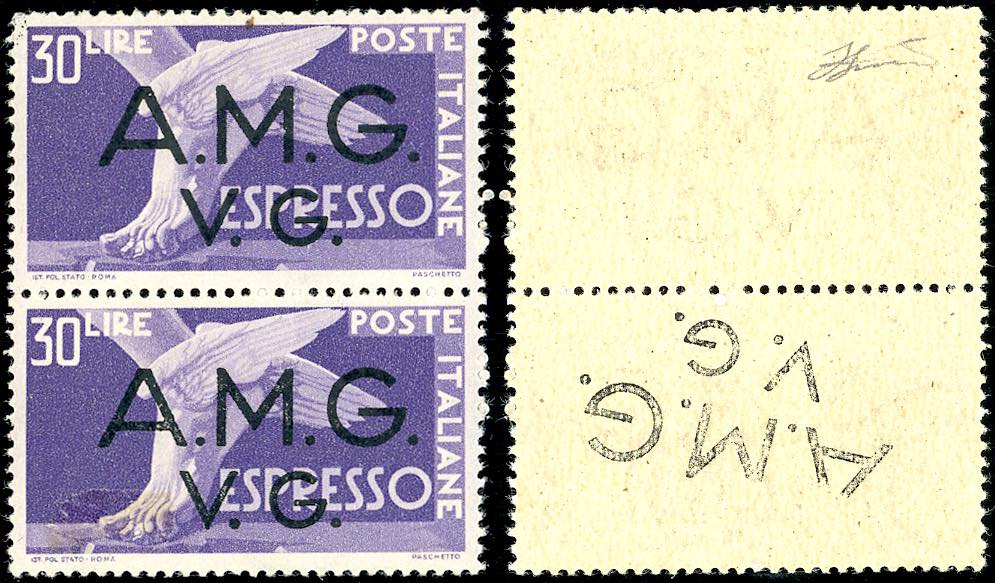 ESPRESSI 1946 - 30 lire, soprastampa recto-verso (2aa), in coppia con il normale, gomma integra, perfetta. RARISSIMA, PROBABILMENTE UNICA. Cert. Avi e Ferrario.