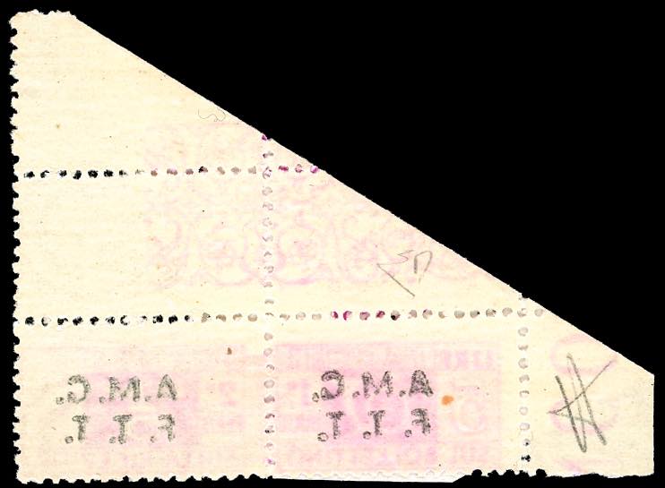 PACCHI POSTALI 1947 - 5 lire, soprastampa su due righe, senza soprastampa nella sezione di sinistra a causa di un anomala piegatura del foglio e con la soprastampa al verso del bordo di foglio (5d), angolo di foglio, gomma originale integra, perfetto. Rara ed appariscente varietà. Cert. E.Diena.