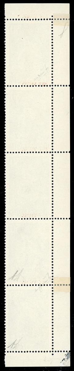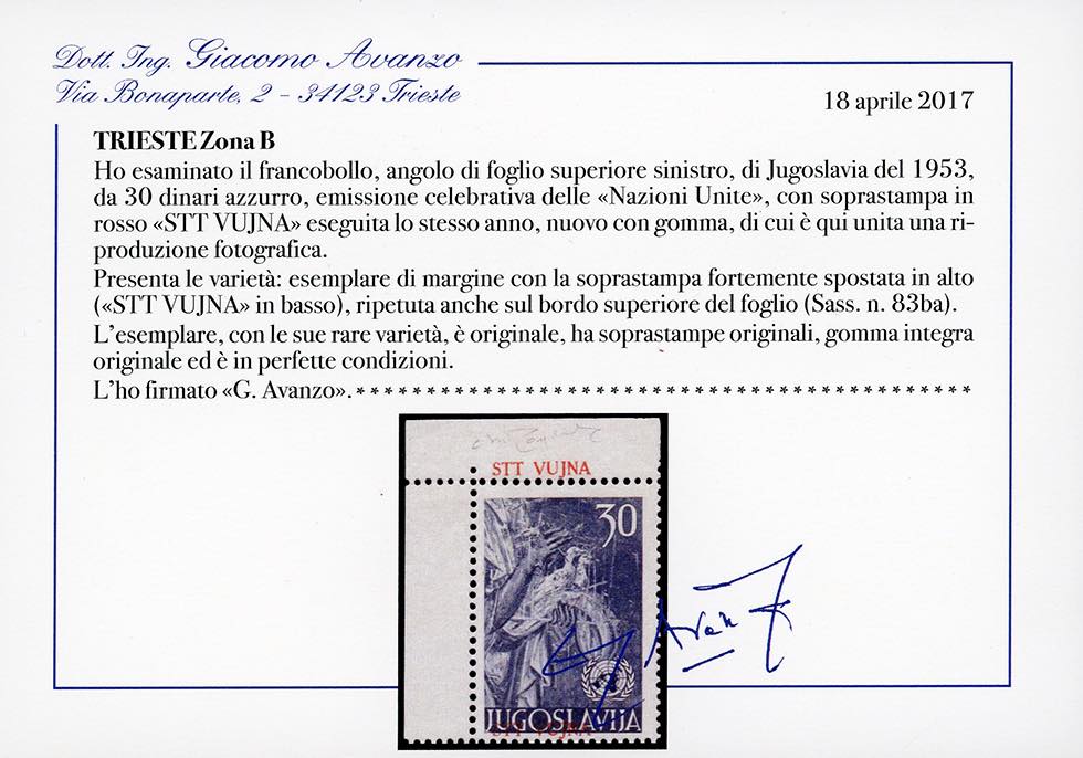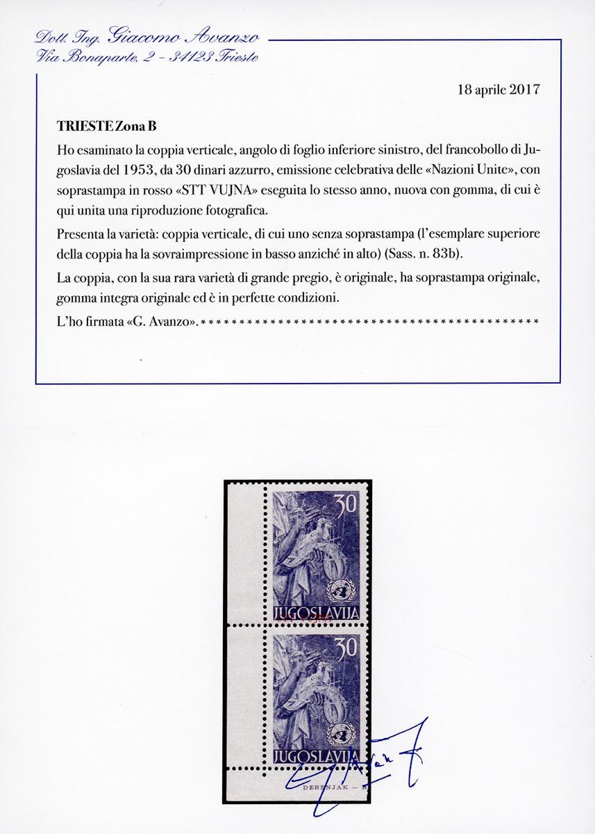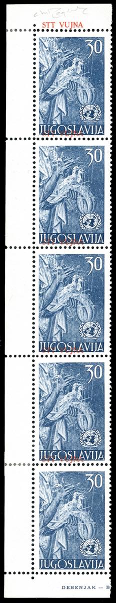 1953 - 30 d. Nazioni Unite, soprastampa fortemente spostata in alto, striscia verticale di cinque, il primo esemplare con la soprastampa ripetuta anche sul bordo di foglio, la coppia inferiore con un esemplare senza soprastampa (83a,83b,83ba), angolo di foglio, gomma originale integra, perfetta. Molto rara. A.Diena, due cert. Avanzo.