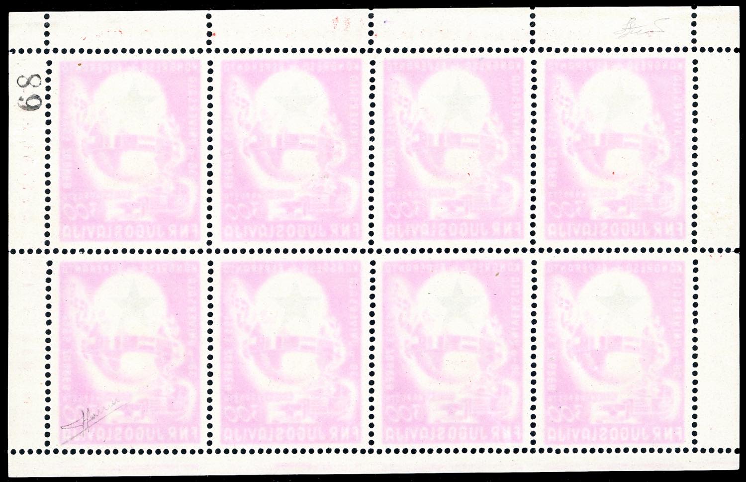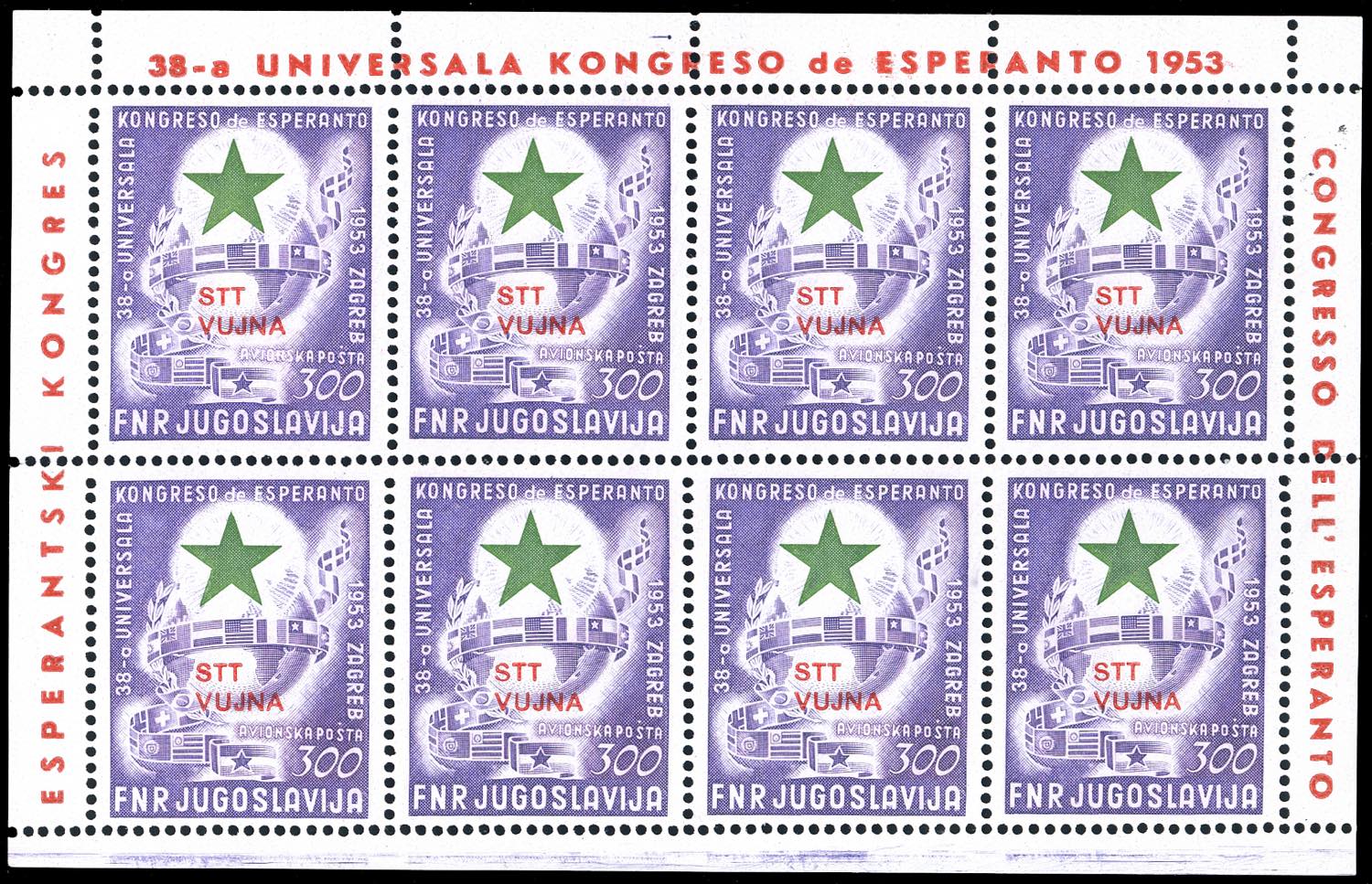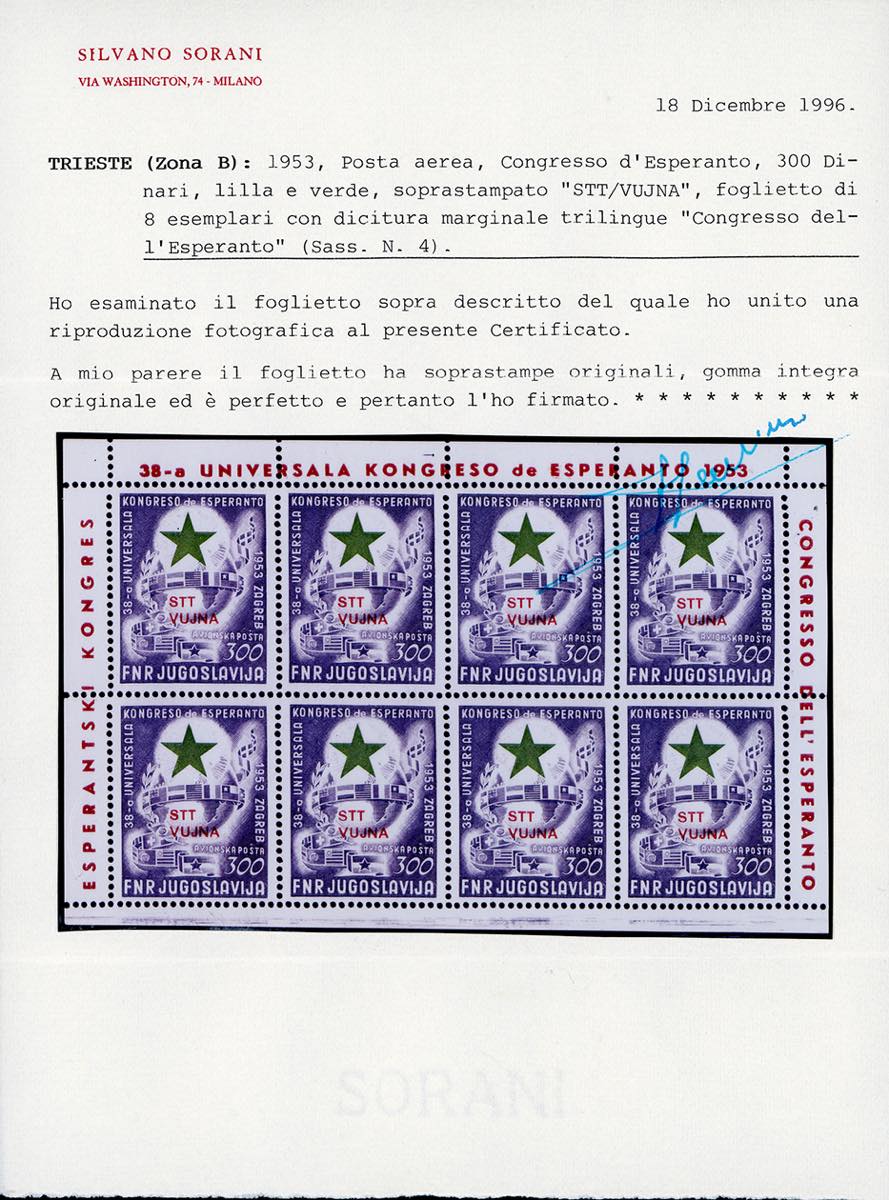 FOGLIETTI 1953 - 300 d. Esperanto, foglietto di 8 esemplari (4), nuovo, gomma originale integra, perfetto. Splendido, con decalco al verso. Cert. Sorani.