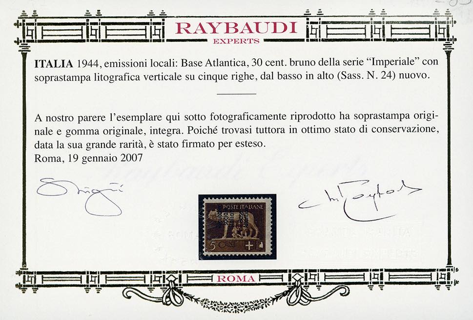 BASE ATLANTICA 1944 - 5 cent. soprastampato (24), gomma originale integra, perfetto. Molto raro, tiratura 200 esemplari. Cert. Oro Raybaudi.