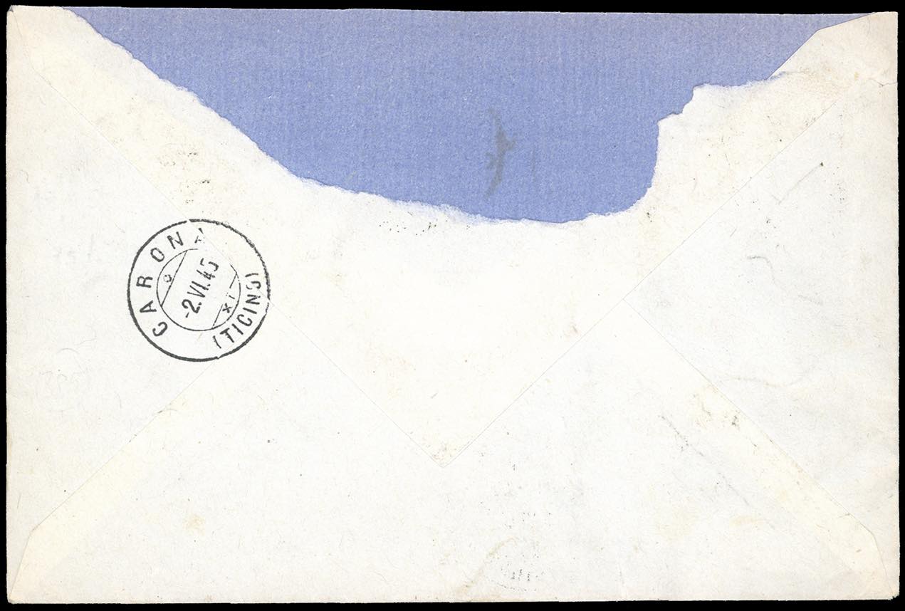 AOSTA 1945 - 50 cent., 1 lira due esemplari, 2 lire e 5 lire Soggetti vari (10,11,12,13), perfetti, su busta da Lanzo d'Intelvi 30/5/1945 a Carona in Svizzera, bollo d'arrivo. Rarissimo uso postale, di cui si conoscono pochissimi casi. Raybaudi.