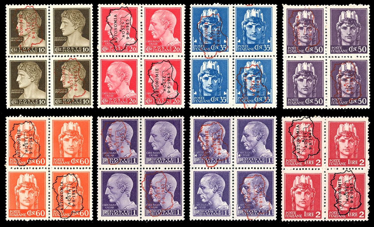 AOSTA EMISSIONE AUTONOMA DI PROPAGANDA 1945 - Serie completa in blocchi di quattro, francobolli di Luogotenenza soprastampati in italiano e ... Leggi tutto