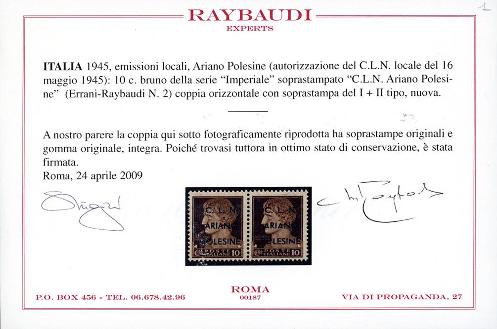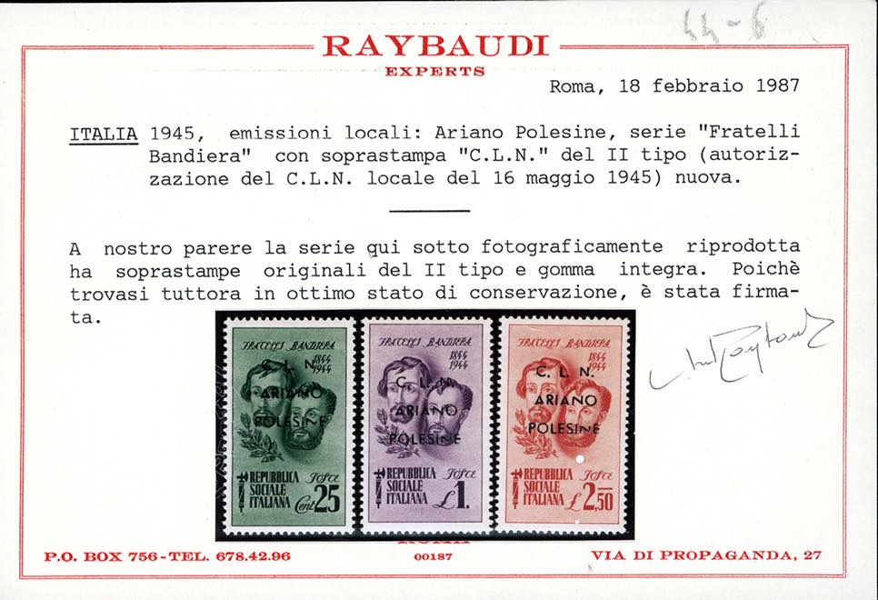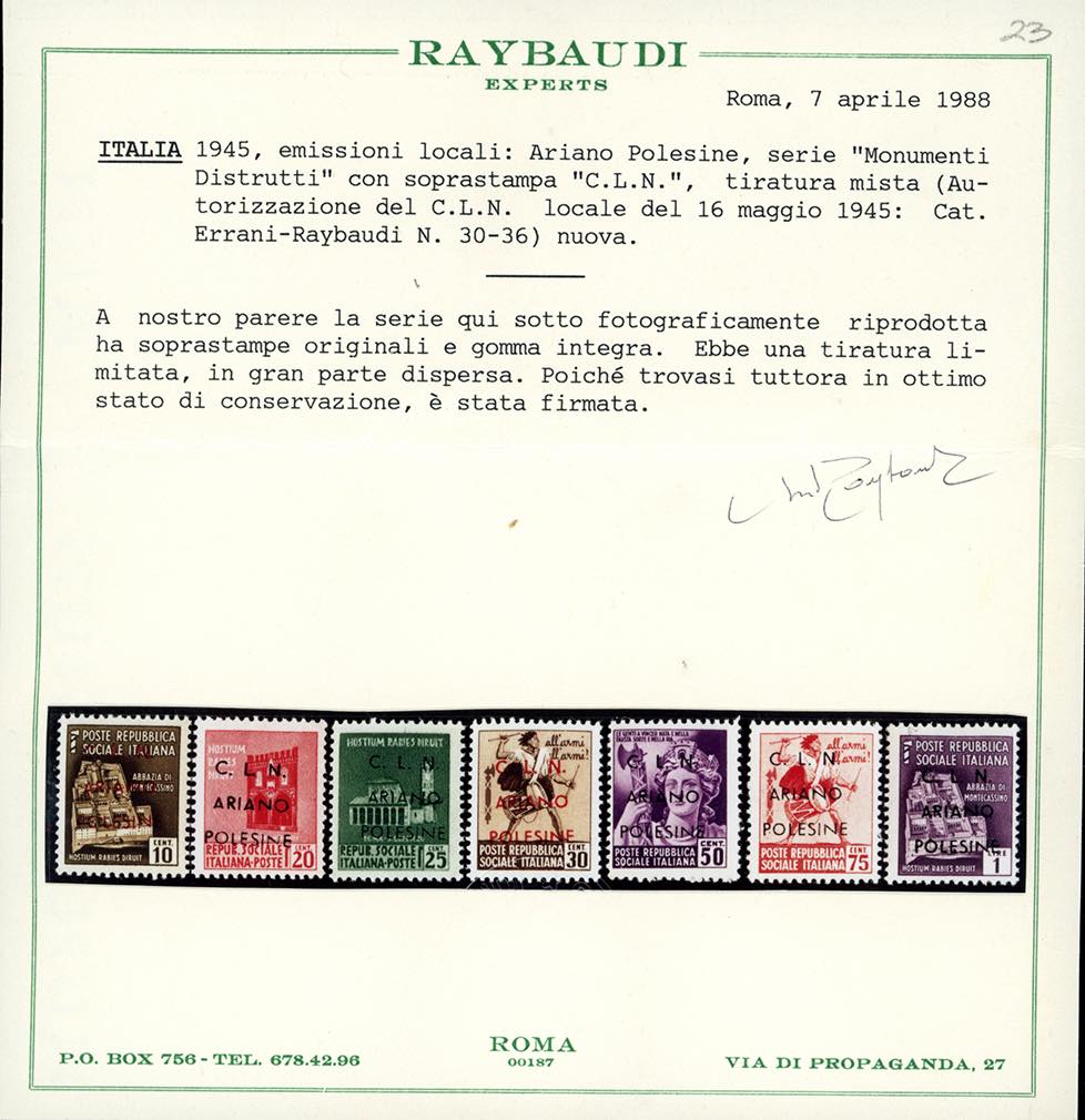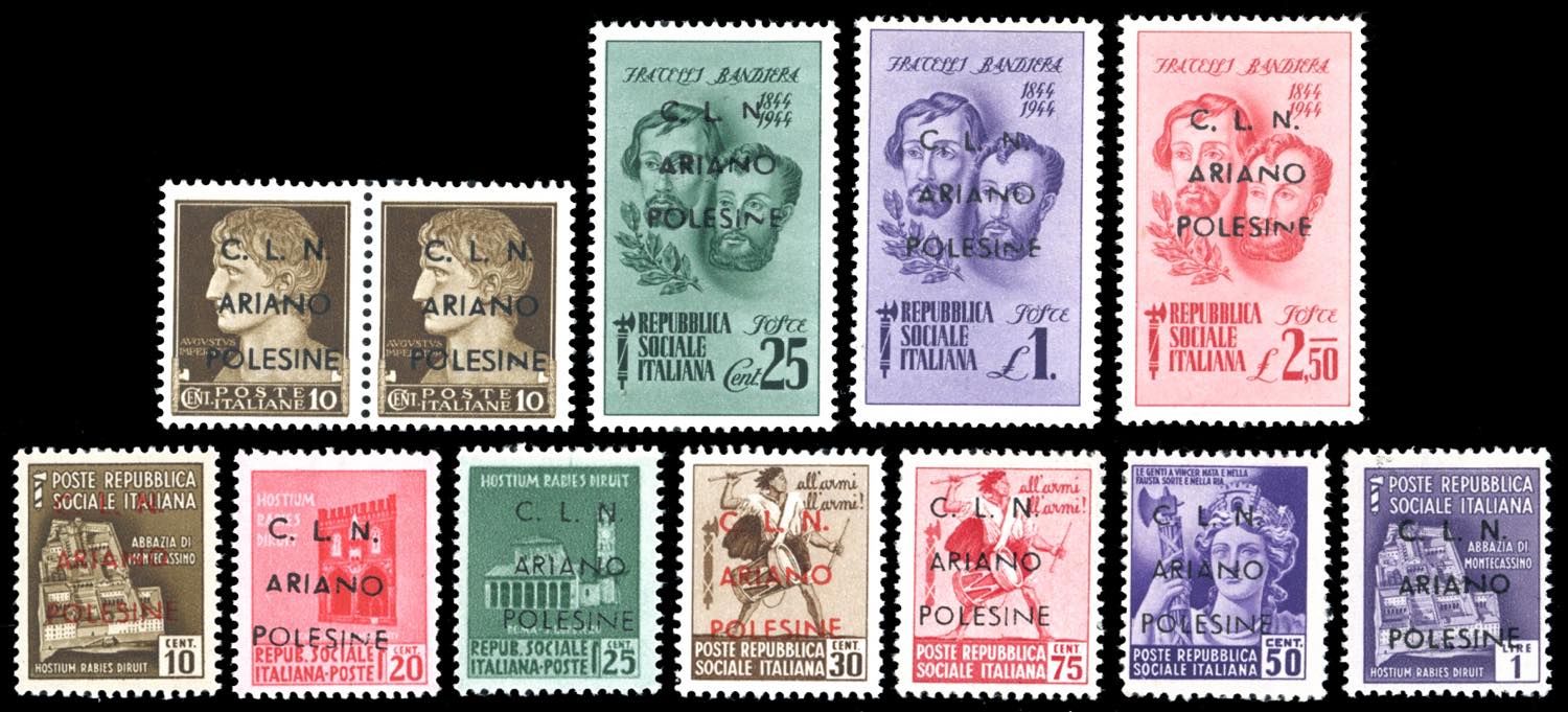 ARIANO POLESINE 1945 - Lotto di 12 esemplari soprastampati (Errani Raybaudi n.2 I e II tipo,30/36,44/46), nuovi, gomma integra, perfetti. Cert. Raybaudi.