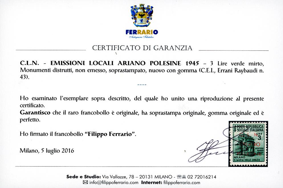 ARIANO POLESINE 1945 - 3 lire Monumenti Distrutti, soprastampa del II tipo (Errani Raybaudi n.43), nuovo, gomma originale, perfetto. Rarissimo, solo 6 esemplari noti di questo tipo. Cert. Ferrario.