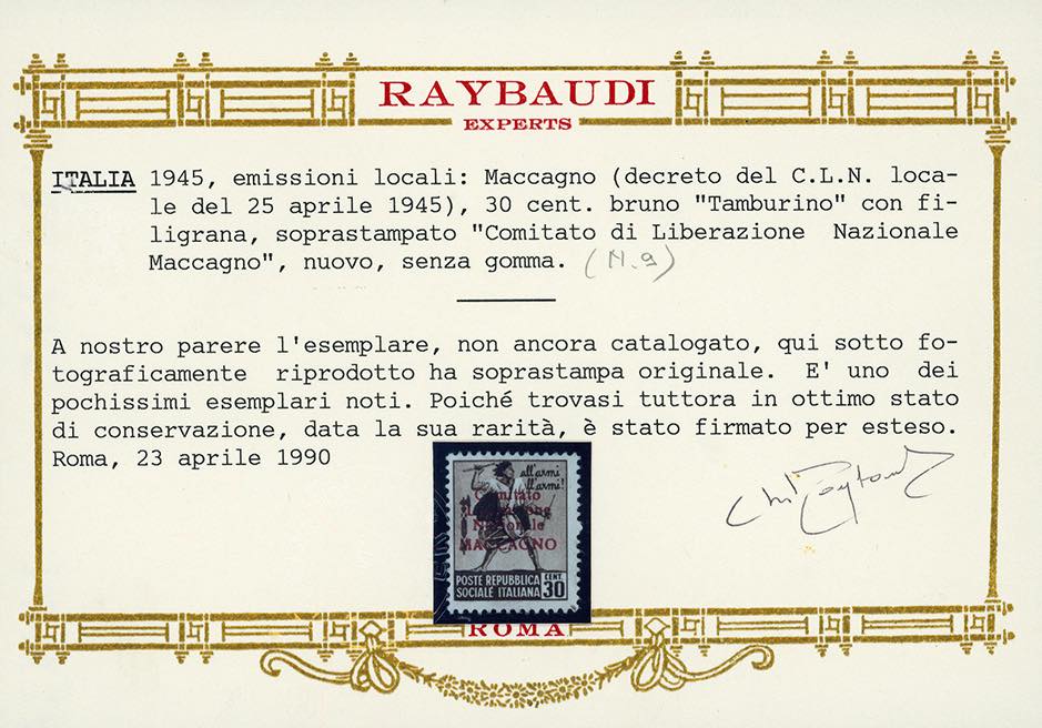 MACCAGNO 1945 - 30 cent. Monumenti Distrutti soprastampato, filigrana corona (9), nuovo senza gomma, perfetto. Molto raro, pochissimi esemplari noti. Cert. Oro Raybaudi.