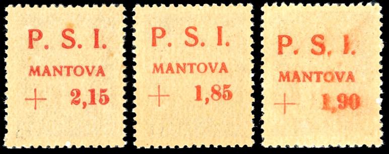 MANTOVA 1945 - 1,90 lire + 10 cent. bruno, 1,85 lire + 15 cent. verde grigio, 2,15 lire + 35 cent. azzurro, Imperiale, soprastampa ... Leggi tutto