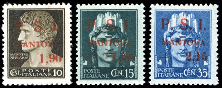 MANTOVA 1945 - 1,90 lire + 10 cent. bruno, 1,85 lire + 15 cent. verde grigio, 2,15 lire + 35 cent. azzurro, Imperiale, soprastampa recto-verso (1aa,2aa,3aa), nuovi, gomma integra, perfetti. Cert. Gazzi-Firenze.