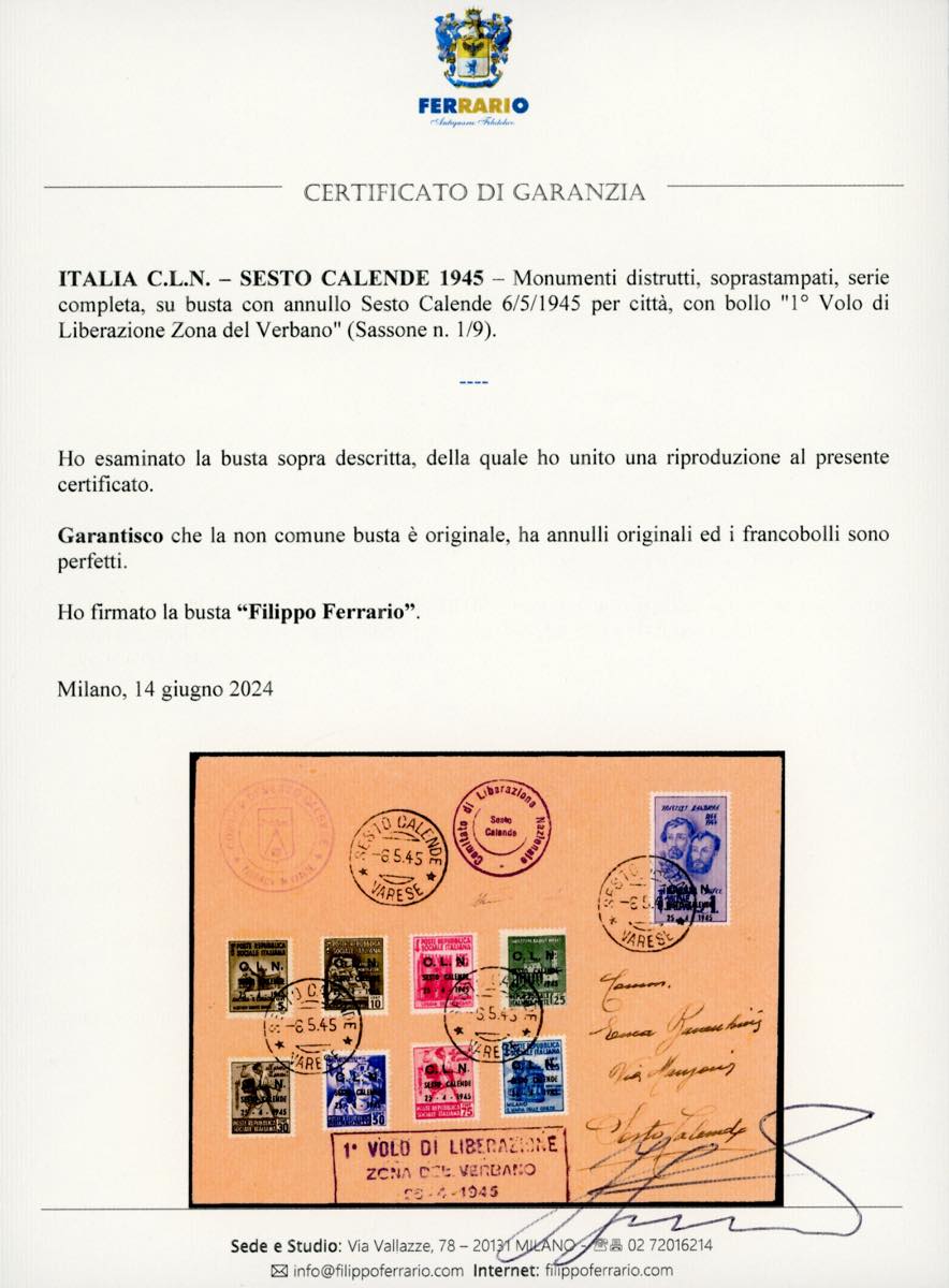 SESTO CALENDE 1945 - Serie completa, soprastampati (1/9), perfetti, su busta con annullo Sesto Calende 6/5/1945 per città, con bollo "1° Volo di Liberazione Zona del Verbano". Interessante e non comune. Fiecchi, cert. Ferrario.