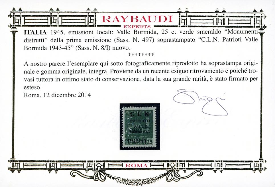 VALLE BORMIDA 1945 - 25 cent. verde smeraldo, Monumenti Distrutti, soprastampa modificata (8/I), nuovo, gomma originale integra, perfetto. Splendido e raro, pochi esistenti. Cert. Oro Raybaudi e Ferrario.