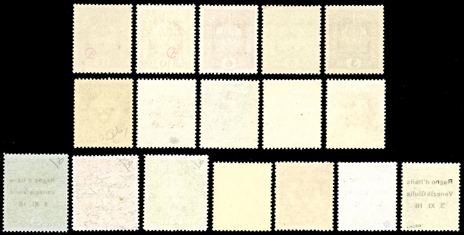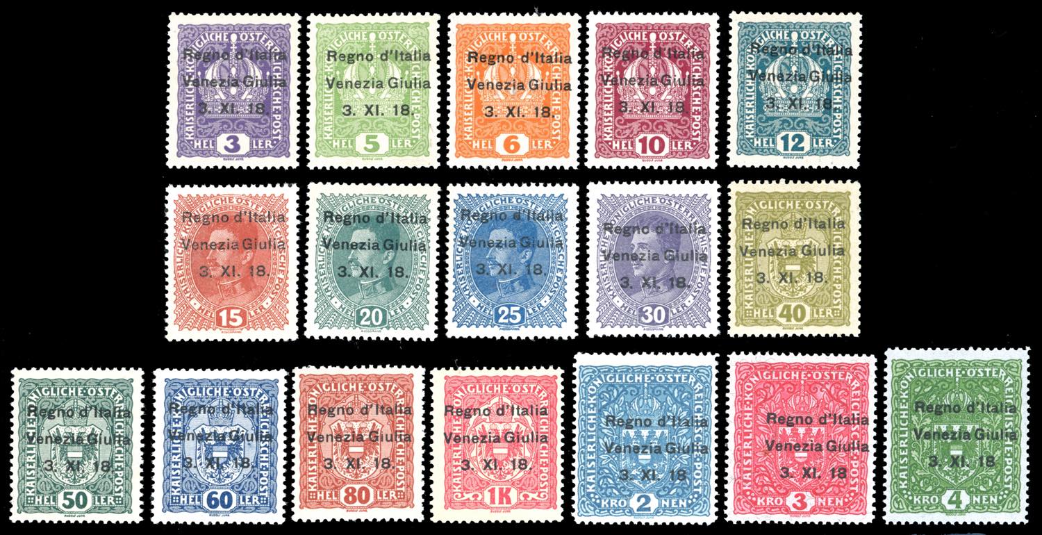 VENEZIA GIULIA 1918 - Prima emissione, soprastampati "Regno d'Italia", serie completa (1/17), nuovi, gomma originale integra, perfetti. ... Leggi tutto