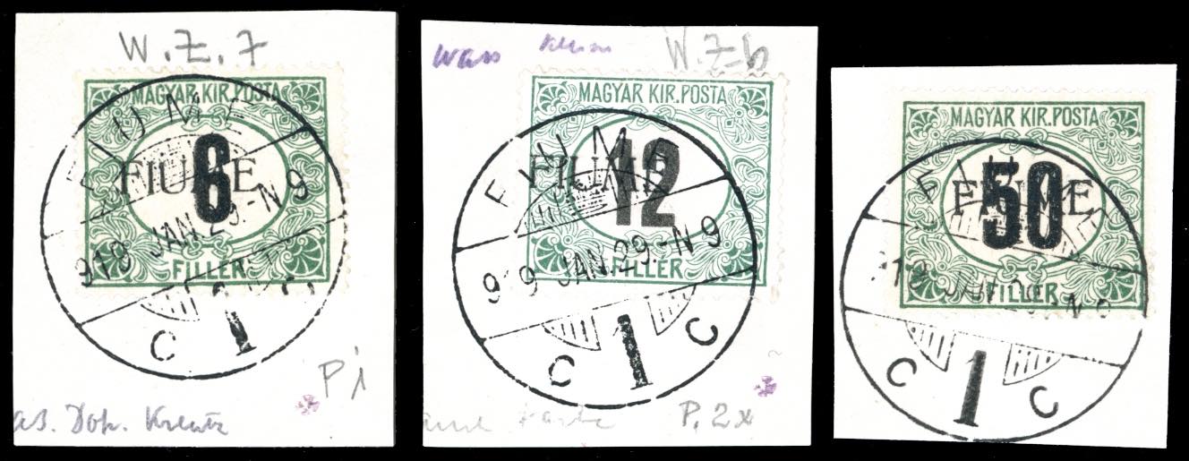 FIUME SEGNATASSE 1918/19 - Cifre nere, soprastampati a macchina, la serie tipo con la filigrana più comune (1/3), perfetti, usati su frammento.