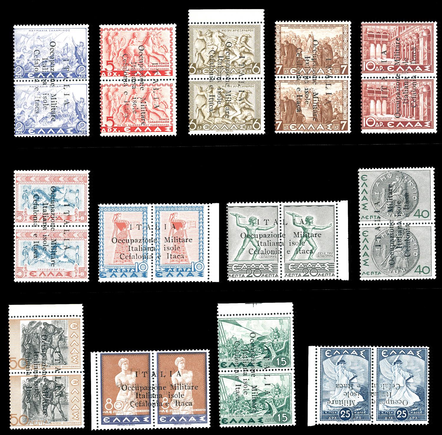 CEFALONIA E ITACA - EMISSIONI DI ARGOSTOLI 1941 - Mitologica soprastampati a macchina in coppie, serie completa, il 25 d. con soprastampa capovolta (11/22,23e), gomma originale integra, perfetti. Cert. Diena.
