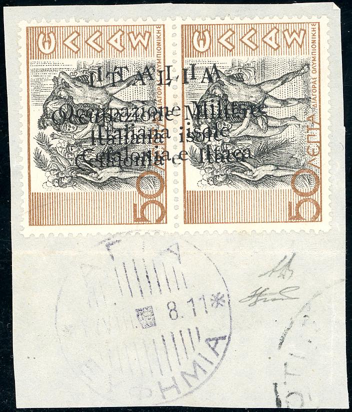 CEFALONIA E ITACA - EMISSIONI DI ARGOSTOLI 1941 - 50 l. + 50 l. Mitologica, doppia soprastampa a macchina (15f), perfetto, usato su frammento. A.Diena, Ferrario.