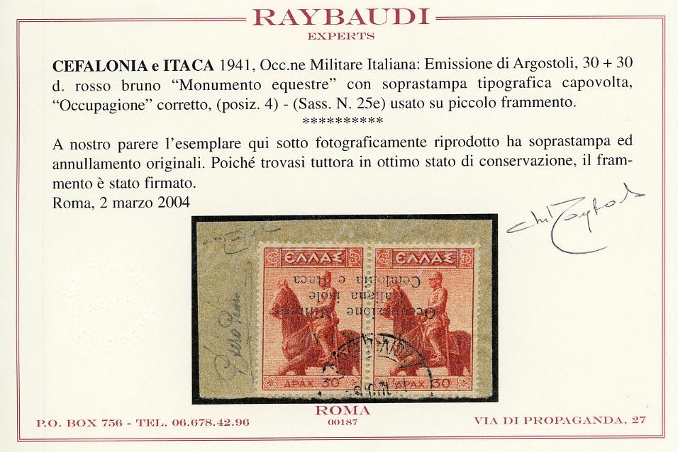 CEFALONIA E ITACA - EMISSIONI DI ARGOSTOLI 1941 - 30 d. + 30 d. Monumento equestre, soprastampa a macchina capovolta, posiz. 4 (25e), perfetto, usato su frammento. Molto bello e raro. Penco, cert. Raybaudi e Ferrario.