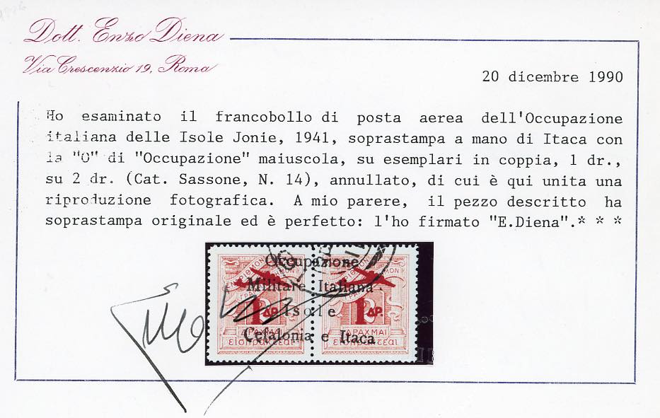CEFALONIA E ITACA - EMISSIONI DI ITACA POSTA AEREA 1941 - 1 su 2 + 1 su 2 d. soprastampato(14), usato, perfetto. Splendido e molto raro. Fiecchi, cert. E.Diena, Ferrario.