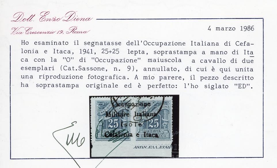 CEFALONIA E ITACA - EMISSIONI DI ITACA SEGNATASSE 1941 - 25 l. + 25 l. soprastampato (9), bordo di foglio, usato, perfetto. Raro. Penco, A.Diena, cert. E.Diena e Ferrario.