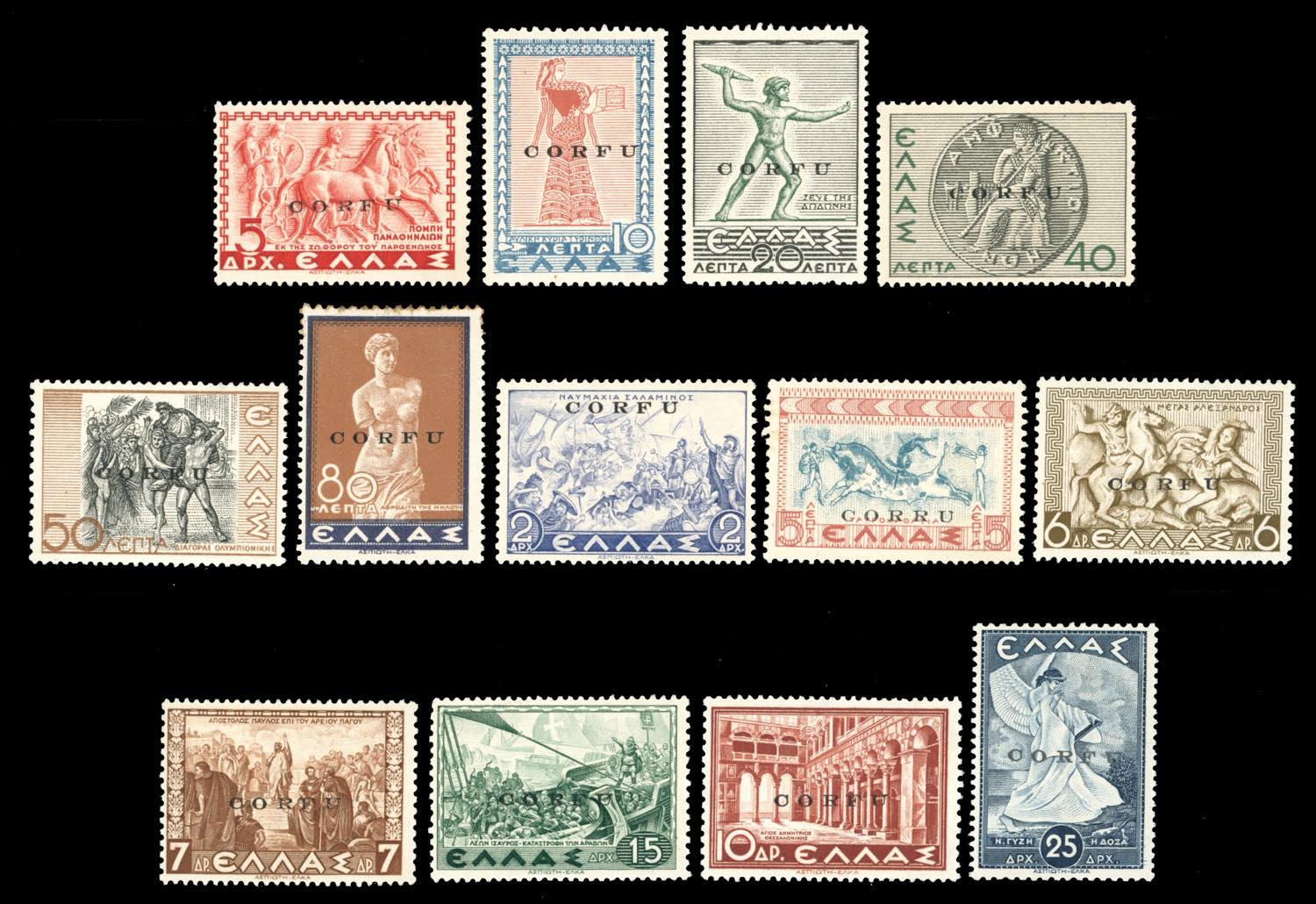 CORFU' 1941 - Mitologica soprastampati, serie completa (19/31), gomma originale integra, perfetti ad eccezione del valore da 8 d. che presenta difetti. Da esaminare con attenzione.