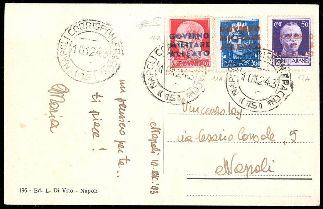 AMGOT OCCUPAZIONE ANGLO-AMERICANA NAPOLI 1943 - Serie completa, tutti gli esemplari della prima tiratura (10A,11A,12A), perfetti, su cartolina da Napoli 10/12/1943 per città. Raro insieme. Cert. Ferrario.