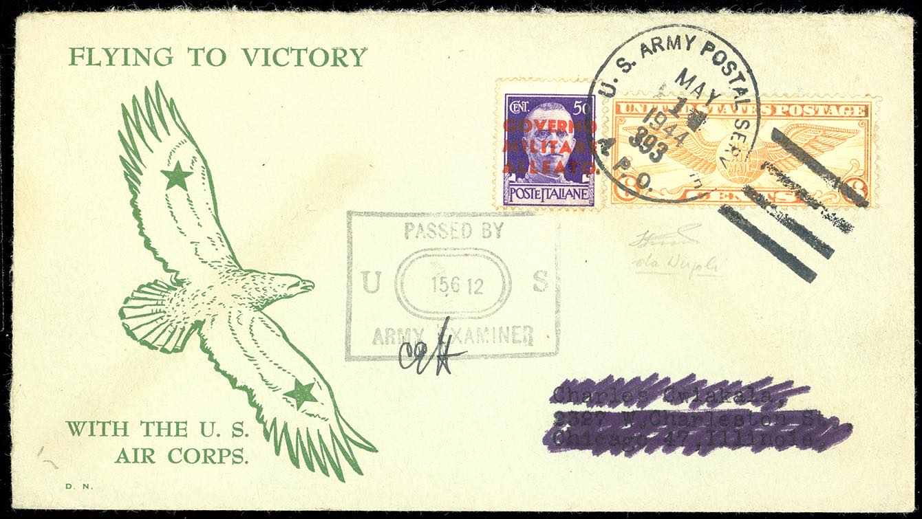AMGOT OCCUPAZIONE ANGLO-AMERICANA NAPOLI 1944 - 50 cent. soprastampato (12), in affrancatura mista con 6 cent posta aerea (Yv.USA A15A), perfetti, su aerogramma dalla posta militare americana di sede a Napoli "APO 393 1/4/1944", verificato per censura. Rara affrancatura mista. Ferrario.
