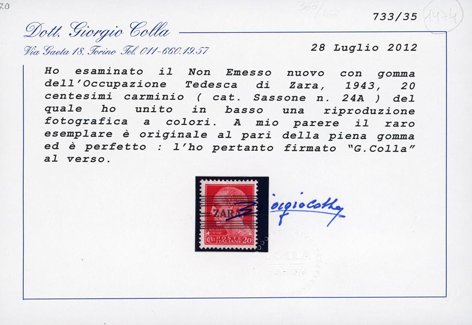 OCCUPAZIONE TEDESCA ZARA 1944 - 20 cent. carminio Imperiale, non emesso, soprastampato (24A), nuovo, gomma originale, lieve traccia di ... Leggi tutto