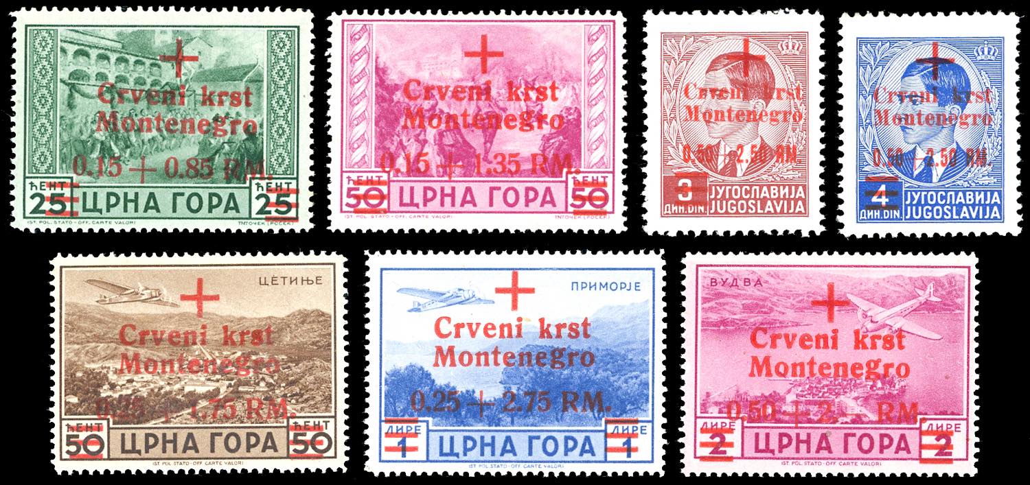 OCCUPAZIONE TEDESCA MONTENEGRO 1944 - Soprastampati Croce Rossa, serie completa (21/24+A9/A11), nuovi, gomma originale integra, perfetti. Ottima qualità.
