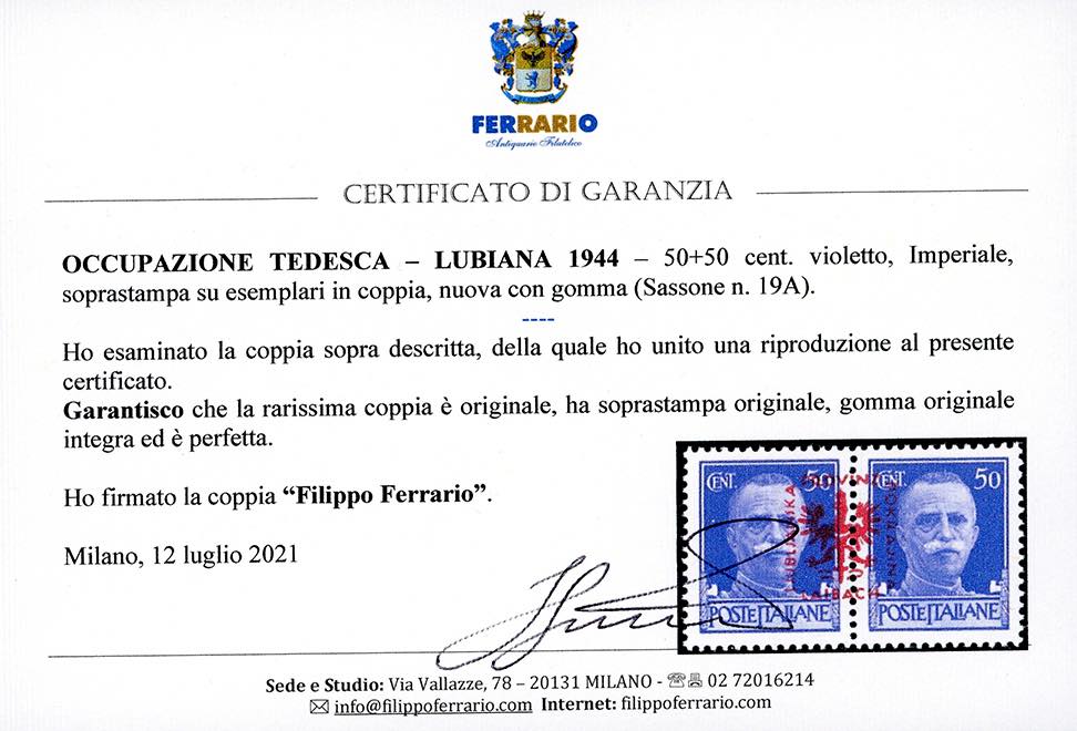 OCCUPAZIONE TEDESCA LUBIANA 1944 - 50 + 50 cent. Imperiale, soprastampa su esemplari in coppia (19A), nuova, gomma originale integra, perfetta. Rarità di ottima qualità. A.Diena, cert. Ferrario.