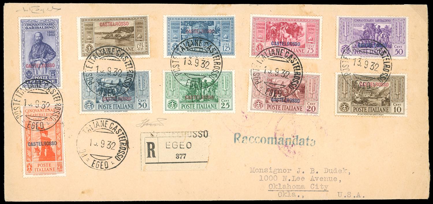1932 - Garibaldi, serie completa (30/39), perfetti, su busta raccomandata da Castelrosso 13/9/1932 per gli Stati Uniti, bollo d'arrivo al verso. Raybaudi, Ferrario.