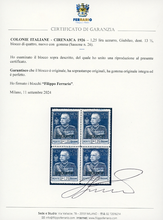 1926 - 1,25 lire Giubileo, dent. 13 1/2 (26), blocco di quattro, gomma originale integra, perfetto. Cert. Ferrario.
