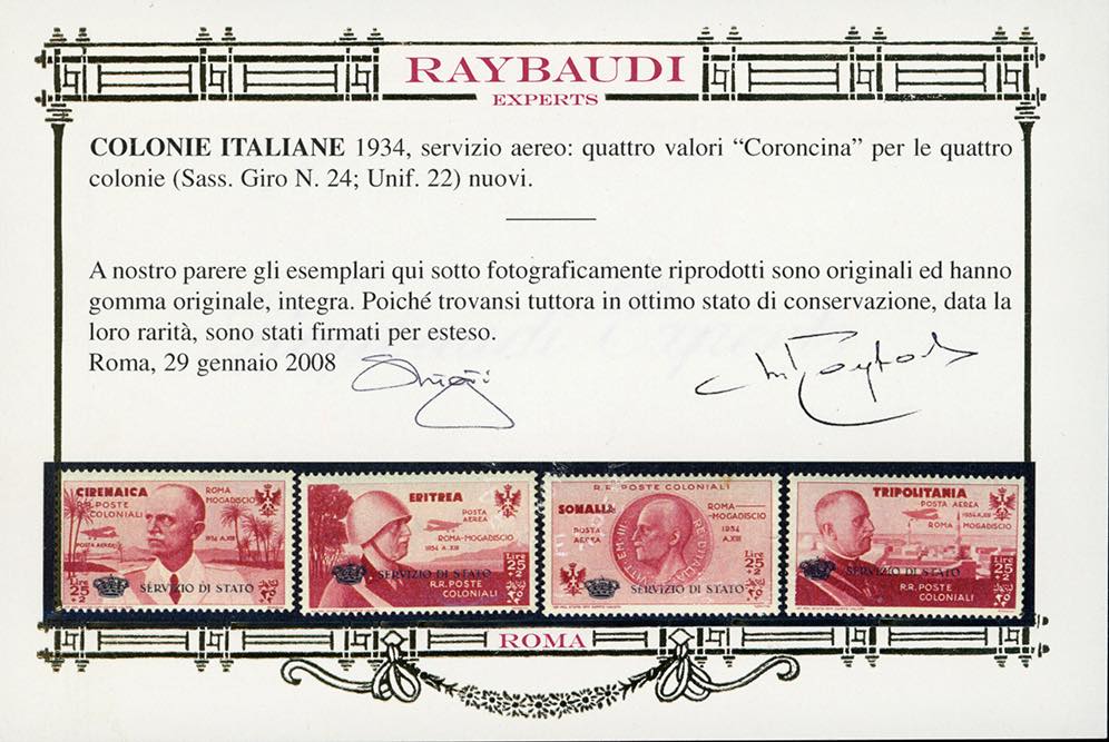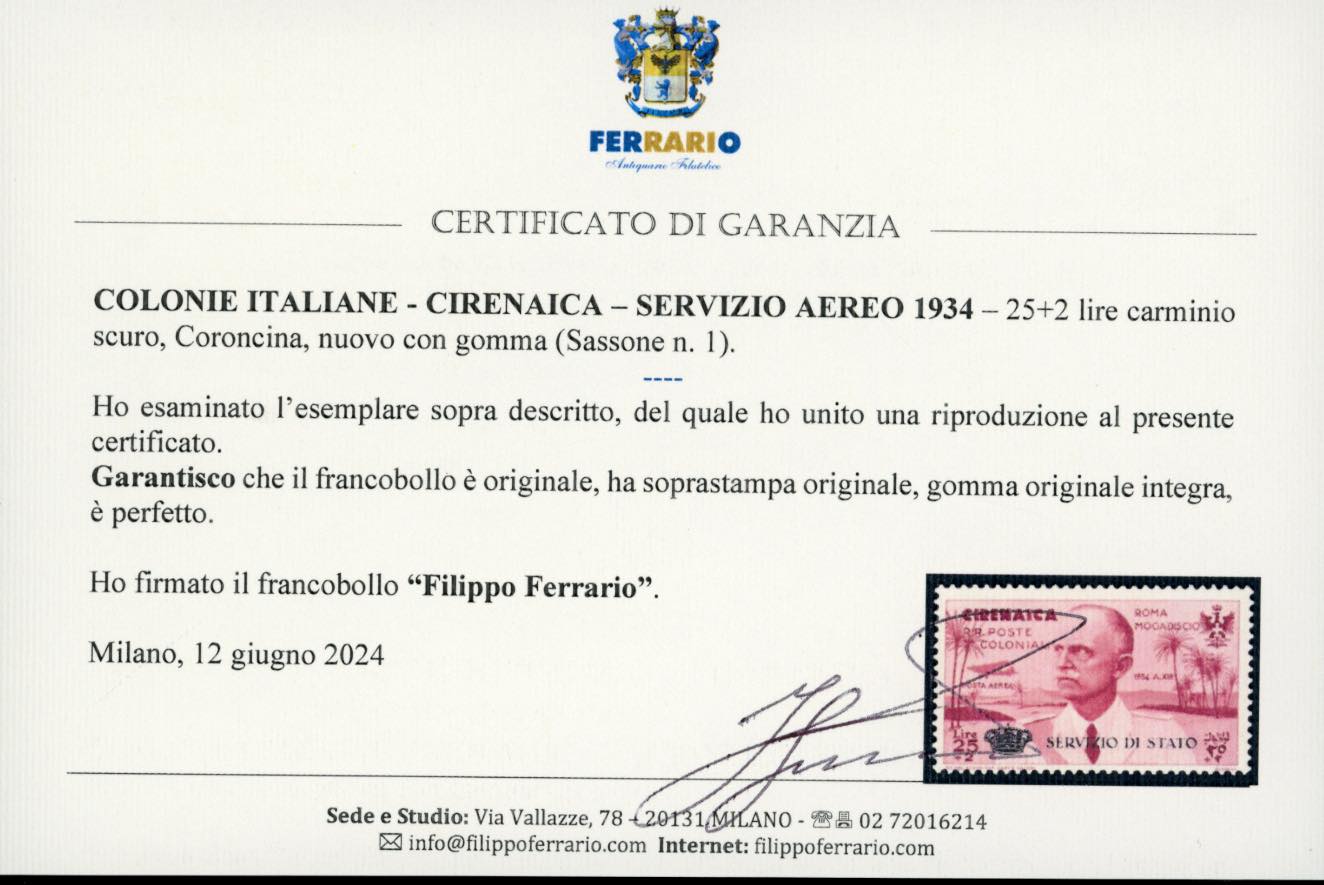 SERVIZIO AEREO 1934 - 25 + 2 lire Coroncina (1), nuovo, gomma originale integra, perfetto, ottima qualità. Oliva, fotocopia cert. Raybaudi e cert. Ferrario.