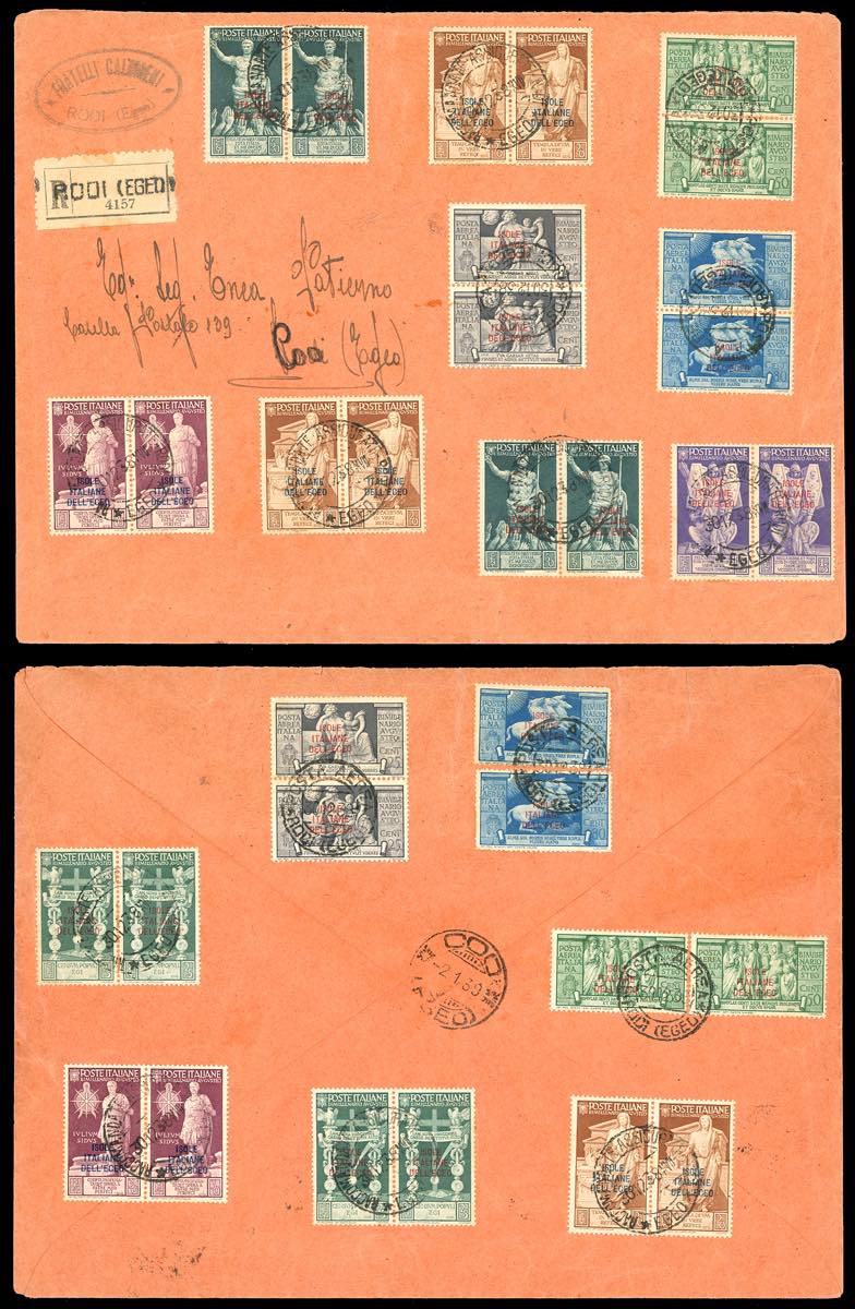 1938 - Augusto, eccezionale affrancatura multipla fronte/retro formata da 15 cent, coppia, 20 cent., sei esemplari, 25 cent., quattro esemplari, 30 cent., quattro esemplari, 50 cent, quattro esemplari, 25 cent., 50 cent. e 80 cent. posta aerea, quattro esemplari ciascuno (100/104,A47/A49), perfetti, su busta raccomandata da Rodi 30/12/1938 a Coo. Rara affrancatura multipla. Ferrario.