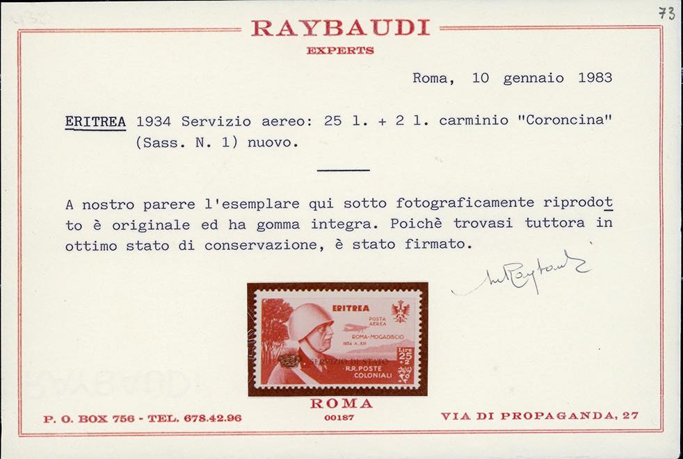 SERVIZIO AEREO 1934 - 25 + 2 lire Coroncina (1), gomma originale integra, perfetto. G.Bolaffi, A.Diena, Chiavarello, cert. Raybaudi e ... Leggi tutto