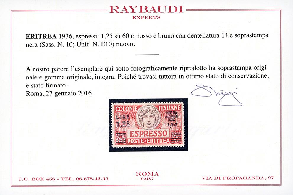 ESPRESSI 1935 - 1,25 lire su 60 cent. rosso e bruno, dent. 13 1/2 (10), nuovo, gomma originale integra, perfetto. Splendido ed ottimamente centrato. A.Diena, Ferrario, cert. Raybaudi.