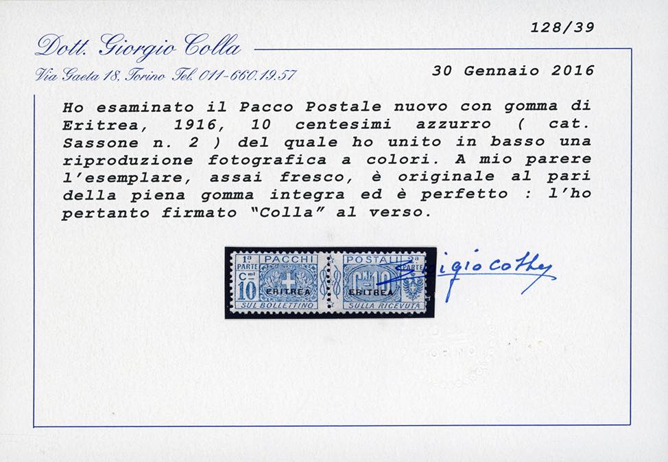 PACCHI POSTALI 1916 - Nodo di Savoia, soprastampati "Eritrea" in caratteri piccoli, serie completa (1/8), gomma originale integra, perfetti e molto freschi. Ottima qualità. Cert. Colla per il raro 10 cent. e Raybaudi per il 3 e 4 lire.