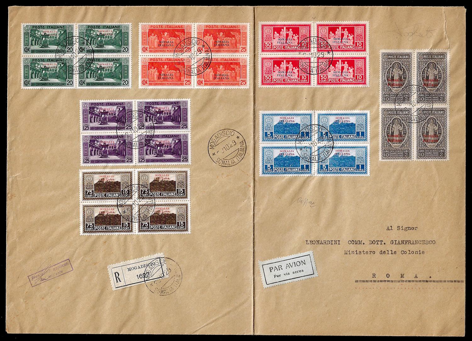 1929 - Montecassino, serie completa (123/129), blocchi di quattro, perfetti ad eccezione di due esemplari del n. 135, su busta raccomandata per via aerea da Magadiscio 28/10/1929 a Roma. Rara. Cert. Caffaz.