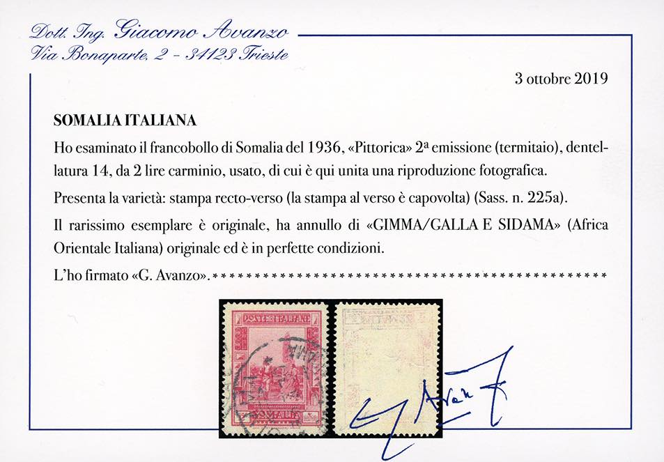 1936 - 2 lire Pittorica, dent. 14, stampa recto-verso (225a), usato, perfetto. Estremamente raro. A.Diena, cert. Avanzo.